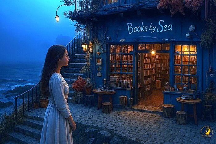 Before the old door where a single lamp spills warmth, she stops— her fingers tracing memory’s spine, searching for the chapter that once lived in her heart.