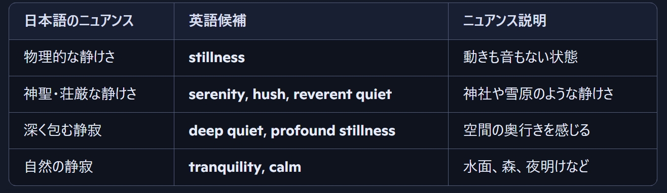 静寂は “silence” ではなく stillness / tranquility / profound quiet の領域。